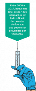 Entre 2008 e 2017, houve um total de 257.405 internações em todo o Brasil, decorrentes de doenças que podem ser prevenidas por vacinação, resultando em 18.903 mortes. Tais internações custaram ao Sistema Único de Saúde (SUS) quase 424 milhões de reais.12 Grande parte dessas mortes e desse gasto poderia ter sido evitada pela vacinação. Atualmente, são disponibilizadas pela rede pública de saúde 17 vacinas para o combate de cerca de 20 doenças.