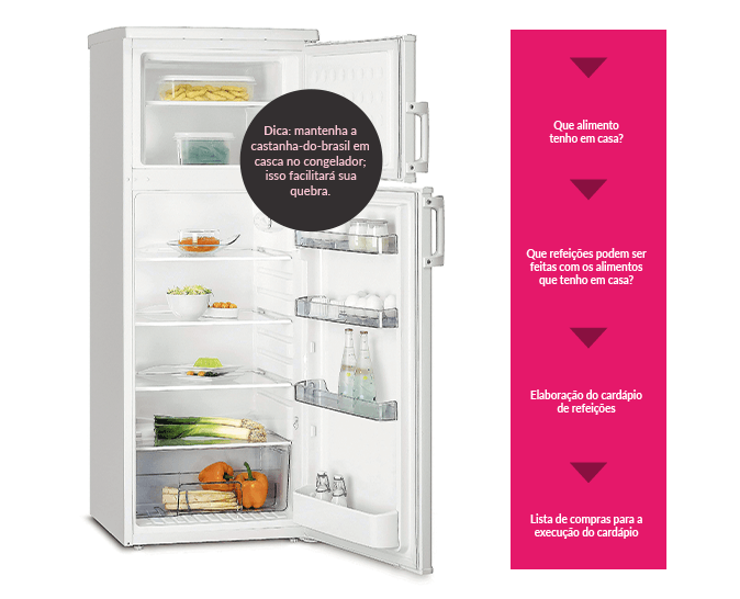 Os produtos frescos são parte importante do cardápio. Neles são encontradas fibras e vitaminas hidrossolúveis (ex.: vitamina C). Enquanto os alimentos frescos mais perecíveis devem ser consumidos nos primeiros dias após a compra (ex.: morango espinafre, etc.), é necessário também ter alimentos com durabilidade intermediária e longa para os demais dias.