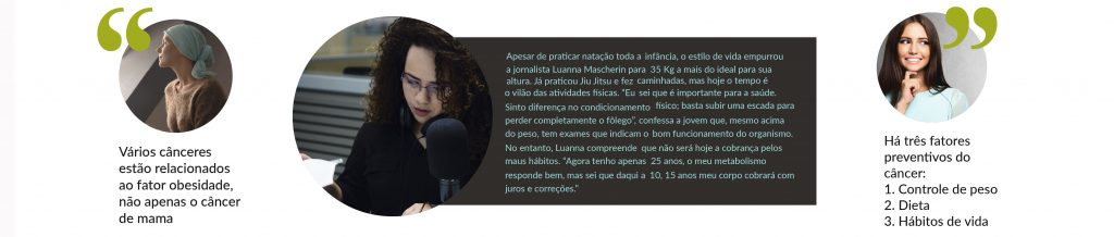 A estimativa feita pelos cientistas brasileiros, americanos e franceses é que até 2025 o Brasil terá mais de 29 mil novos casos de cânceres relacionados à elevação do Índice de Massa Corpórea (IMC). E, nesse caso, quem sai perdendo são as mulheres, por ter o maior índice de diagnósticos de tumores de ovário, útero e mama, cânceres relacionados ao sobrepeso. Mas a lista não para por aí, é o que explica Cicília Marques, oncologista do Instituto Brasileiro de Controle do Câncer (IBCC). “Vários cânceres estão relacionados ao fator obesidade, não apenas o câncer de mama. Câncer de endométrio, que é o câncer de útero; câncer de intestino, que chamamos de colorretal; câncer de esôfago, de rim, entre outros – eles todos têm relação também com a obesidade”, alerta Se a luta contra a balança é muitas vezes injusta, imagine se os quilos a mais vierem associados ao tratamento de câncer. Neuza Maria Thomas sempre foi muito ligada à aparência. Bancária aposentada, ela se deparou com um diagnóstico que mudou completamente sua rotina. Entre a descoberta do câncer e a quimioterapia foram aproximadamente dois meses. “Foram oito ciclos de quimioterapia e durante o tratamento não tive muitos problemas, nem reações fortes, mas engordei bastante porque comia muita massa, que era das poucas coisas que não davam enjôo.” Após essa fase a paciente realizou os ciclos de radioterapia e depois tomou uma vacina. Ao todo, passaram- se dois anos, “e nesse período eu não realizei nenhuma atividade física, só depois”, justifica.