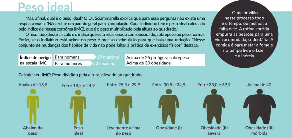 Fatores emocionais Na psicoterapia, a compulsão alimentar é chamada de fome emocional. Para a psicóloga Gabriela Pioli, essa fome fisiológica pode muitas vezes ser desencadeada por uma fome emocional. “Essa vontade de saciar-se vem porque há um vazio. Por que você quer se sentir cheio? Porque há um vazio. Mas no caso da obesida-de esse vazio não é só por comida, o obeso come as próprias emoções”, elucida a profissional, que ainda acrescenta que o desejo por mudança é apenas um dos fatores para de fato estabelecer novos comportamentos. “Há um desejo de mudança, mas a realização dela depende da aceitação da própria história. Quando você se compreende, integra as suas dores, transformando-as, aí, sim, você está apto para trilhar o caminho da mudança”, reitera. Mas nem sempre a força de vontade é o suficiente para se ver em forma. Em alguns casos, fatores hormonais dificultam o processo de emagrecimento. O problema metabólico mais comum para justificar a obesidade é o hipertireoidismo, quando a taxa de hormônios é diminuída e o metabolismo fica um pouco mais lento. Mas não necessariamente a pessoa se torna obesa por conta da disfunção na tireoide. “O problema contribui, mas o que gera o sobrepeso ou até a obesidade são as escolhas alimentares e hábitos de vida sedentários”, explica o médico endocrinologista Raffaele Sciammarella Sobrinho, que com frequência recebe os pacientes com problemas como hipertensão, diabetes ou até hormonais, quadros que necessitam de emagrecimento para aumentar a qualidade de vida. Em todos os casos a resposta é sempre a mesma: “Não tem como fugir: a prática de exercícios físicos é recomendada mesmo que o IMC não esteja elevado. O movimento é importante para o funcionamento de órgãos vitais, como o cérebro e o coração”, reforça. E por falar em coração, não é novidade a relação entre a falta de exercícios físicos e as doenças cardiovasculares. Quanto maior a frequência da prática, maior o consumo de oxigênio que, por sua vez, diminui o débito cardíaco ao manter o volume sistólico – volume de sangue bombeado pelo ventrículo cardíaco. Ou seja, quanto maior o desempenho cardiovascular, maior a capacidade de viver bem.
